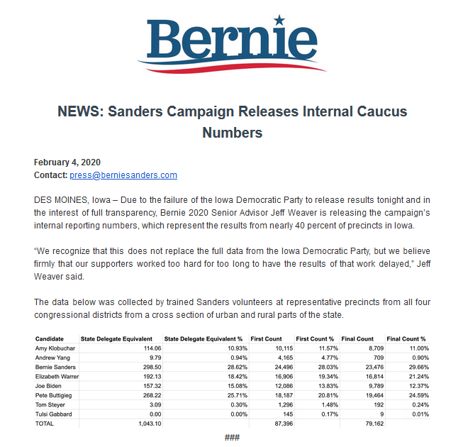 So as can be seen we still need to wait for the official Iowa Caucus results, so I would not latch on to what any of the candidates are claiming just about yet as it is clearly too close to call.